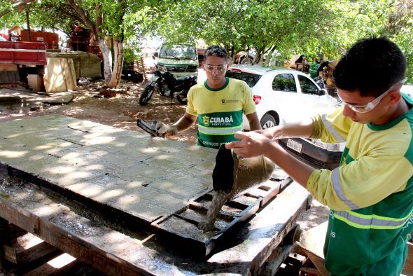 Em termos de qualidade, o material também não perde em nada para o que é produzido em grandes indústrias. Cimento, areia, água, e uma porção diária de empenho e dedicação. Essa é a fórmula de sucesso que tem gerado uma grande economia aos cofres do Município. A mistura, feita de segunda a sábado pelas mãos de quatro trabalhadores da Secretaria Municipal de Serviços Urbanos, tem resultado na produção de mais de 1.000 tijolos ecológicos, por dia, que são frequentemente utilizados nas revitalizações de praças e calçadões históricos de Cuiabá. De simples fabricação, o produto é considerado uma alternativa importante para o desenvolvimento sustentável da cidade. Isso porque, seu processo de confecção é feito mediante a dispensa de forno de aquecimento, evitando assim a queima de carvão ou madeira e, consequentemente, a emissão de gases poluentes na atmosfera. Além disso, tal procedimento também ajuda na manutenção da saúde dos trabalhadores, já que não existe o contato com fumaça. “Verificamos que existia uma necessidade constante de utilização desses tijolos nos nossos trabalhos de revitalizações, e procuramos estudar uma maneira de reduzir os custos nesse tipo de serviço. A fabricação é uma ação tão simples, mas que podemos afirmar que dá para se ter uma economia de pelo menos 50% em relação ao preço que pagaríamos se fossemos adquirir os tijolos de algum fornecedor”, comentou o secretário José Roberto Stopa. Para obter o resultado final, os servidores dividem a fabricação em duas etapas. A fase inicial consiste na mistura de todos os produtos dentro de uma betoneira. Logo na sequência é estabelecido o processo de cura da massa homogênea, onde se leva cerca de 18 horas até que substância seque e ganhe a solides necessária. A fôrma também passa por uma preparação, onde é lavada com óleo diesel, para que a soltura do tijolo seja facilitada. Os tijolos são produzidos em dois formatos. O primeiro, considerado o modelo padrão, possui 20 cm de comprimento, 10 cm de largura e 8 cm de altura. Existe ainda o de molde reduzido com as seguintes dimensões: 10 cm de comprimento, 10 cm de largura e 8 cm de altura. Essa segunda forma é desenvolvida pensando na parte de acabamento, reduzindo assim a quebra dos tijolos maiores para este fim e evitando o desperdício. Segundo o diretor de Paisagismo, Anderson Peter, com uma carga de trabalho de 44 horas semanais, os servidores conseguem fabricar uma quantidade suficiente para atender todas as demandas apresentadas,inclusive as das demias secretarias municipais. Ele destaca ainda que, em termos de qualidade, o material também não perde em nada para o que é fabricado em grandes indústrias. “Vamos fabricando conforme a demanda, mas também sempre deixamos uma boa quantidade de reserva técnica de manutenção, para casos emergenciais. Em uma reforma feita, por exemplo, em um desses calçadões, chegamos a utilizar mais de 7 mil tijolos. Vale destacar ainda que, em relação à qualiadade, também temos um ganho muito satisfatório. É um material extremamente resistente, que tem uma grande durabilidade”, pontuou o diretor.