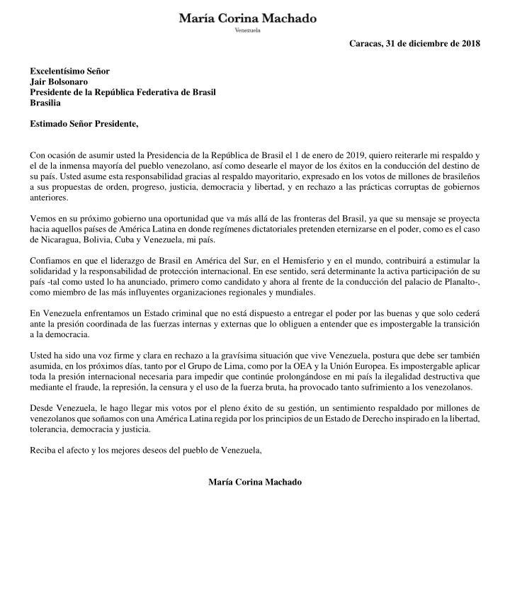 Em carta, María Corina Machado disse que vê posse do novo governo brasileiro como "oportunidade" para que o regime chavista entenda que "transição para a democracia é inadiável". A dirigente opositora venezuelana María Corina Machado pediu ao presidente eleito do Brasil, Jair Bolsonaro, que lidere uma maior "pressão internacional" contra o regime de Nicolás Maduro que o faça "entender que é inadiável a transição para a democracia" no país. "Vemos em seu próximo governo uma oportunidade que vai além das fronteiras do Brasil, já que sua mensagem se projeta para aqueles países da América Latina onde regimes ditatoriais pretendem se eternizar no poder, como é o caso da Nicarágua, Bolívia, Cuba e Venezuela", disse Machado a Bolsonaro em carta aberta divulgada nesta segunda-feira (31/12).