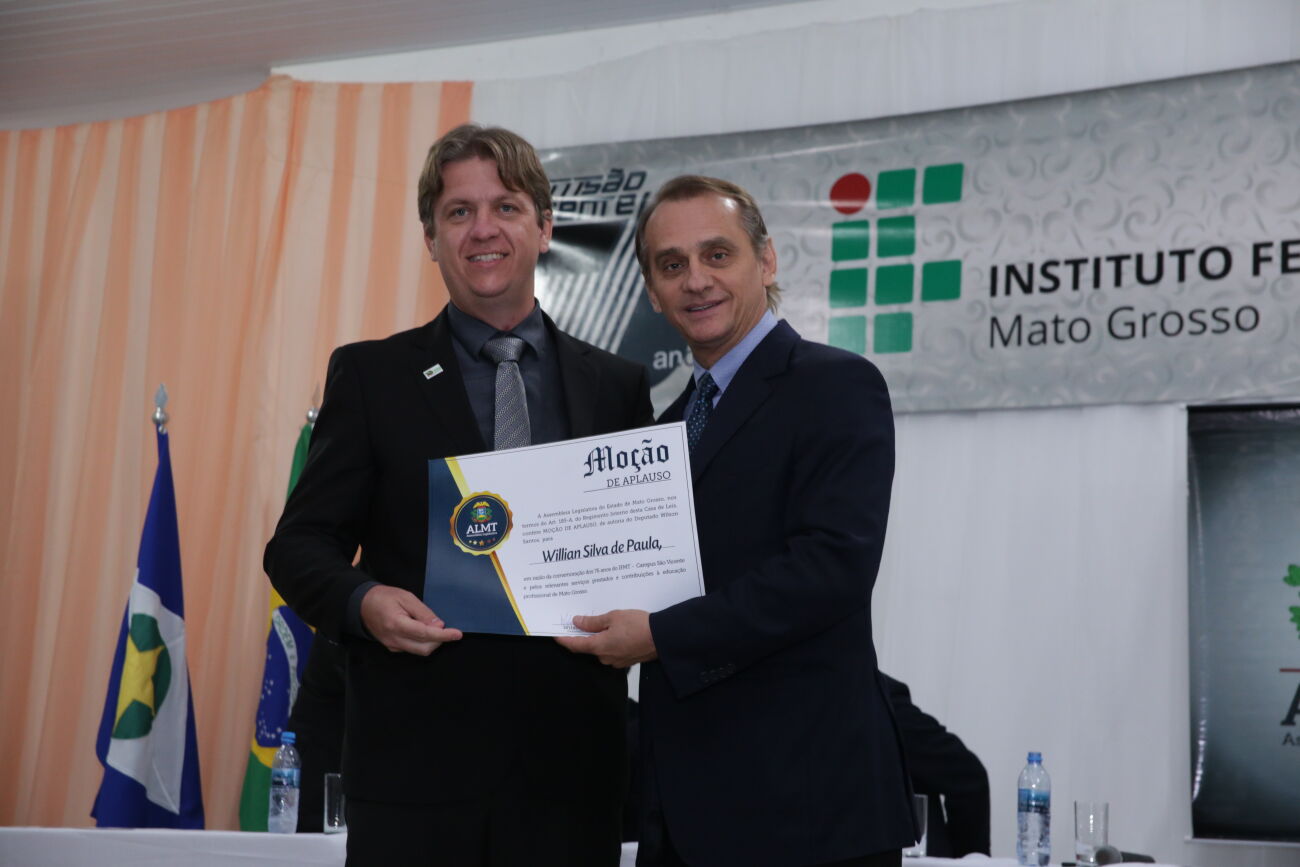 De autoria do deputado estadual Wilson Santos, moção de aplausos homenageou 45 profissionais que se dedicam diariamente à educação. Em uma iniciativa liderada pelo deputado estadual Wilson Santos (PSDB), a Assembleia Legislativa realizou na tarde de sexta-feira (12) uma homenagem aos 76 anos de existência do Instituto Federal de Mato Grosso (IFMT) localizado na Serra de São Vicente. A solenidade ocorreu no auditório Jonas Pinheiro, na sede da instituição de ensino.No total, foram homenageados com moção de aplausos 45 pessoas, entre professores, colaboradores, ex-alunos e técnicos administrativos que auxiliam diariamente a instituição nas atividades de ensino.